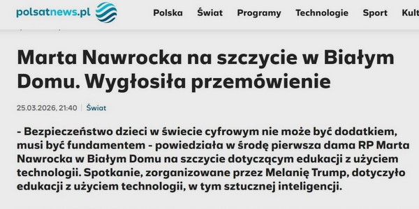 Pierwsza dama Rzeczpospolitej Polskiej Marta Nawrocka kilka dni temu w Białym Domu w Waszyngtonie wygłosiła przemówienie, w którym zawarła takie oto słowa: „Bezpieczeństwo dzieci w świecie cyfrowym nie może być dodatkiem, musi być fundamentem.”. Jak podaje Polsat News: „Spotkanie, zorganizowane przez Melanię Trump, dotyczyło edukacji z użyciem technologii, w tym sztucznej inteligencji.” TVP Info pisze z kolei: „Dzieci i młodzież spędzają w internecie coraz więcej czasu. Często nie mają narzędzi, aby rozpoznawać zagrożenia – mówiła Nawrocka, wyliczając cyberprzestępczość, uzależnienia, czy manipulację informacją”.