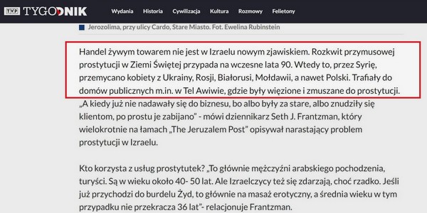 Przypomnijmy, że reżim syjonistyczny a konkretnie mafie przez niego ochraniane w latach 1990. pozyskiwały z Polski oraz innych krajów Europy Środkowej i Wschodniej kobiety i wywoziły je do Izraela aby zmuszać je do prostytucji.